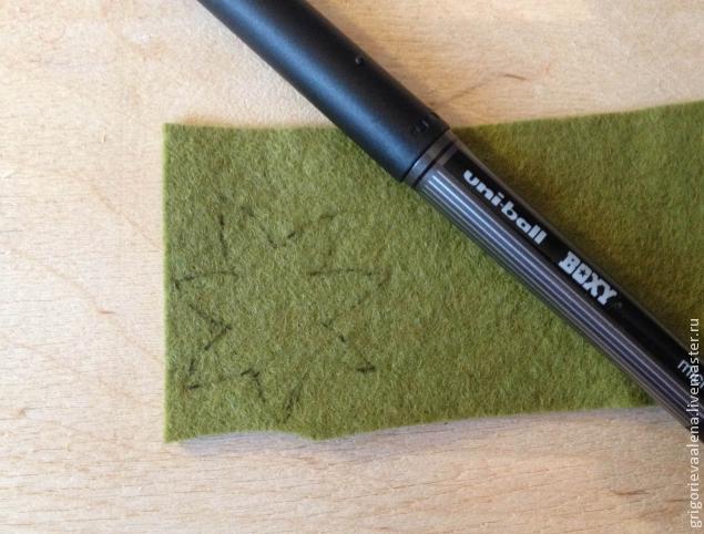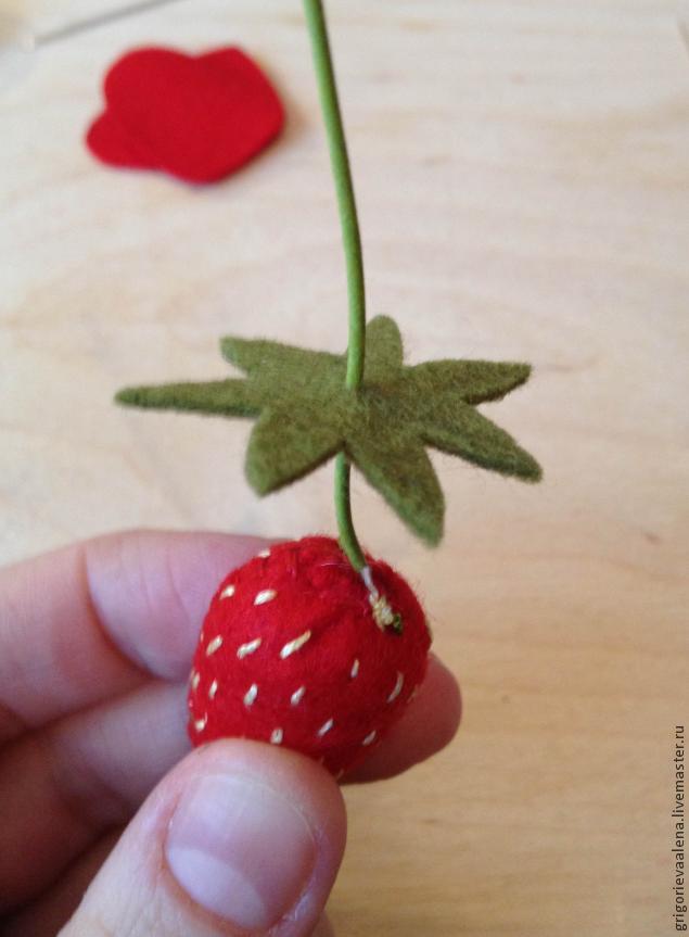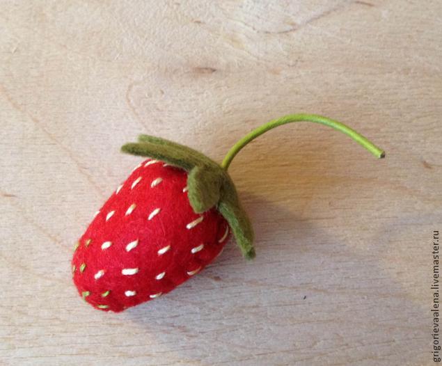 Для листиков рисуем, а потом вырезаем из зеленого фетра заготовку листочка. Не обязательно делать их ровными - так клубничка получится более натуральной.