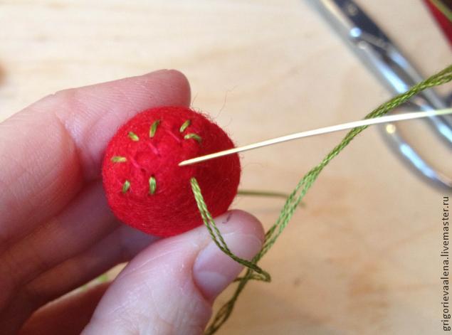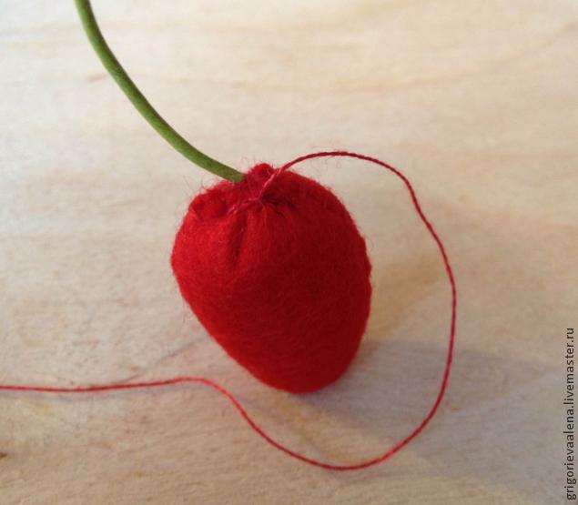 Затем, протягиваем нить с верха ягодки в противоположный край, как бы скругляя ее.