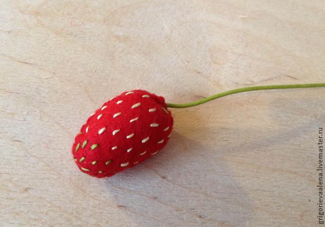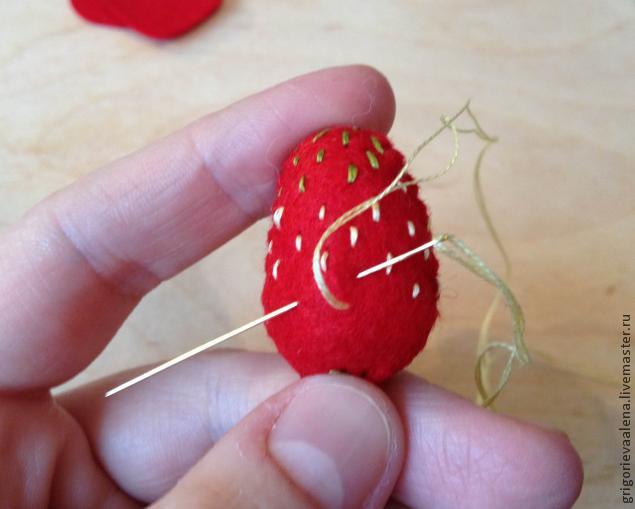 Набиваем клубничку синтепоном. Синтепона не жалейте, набивайте плотнее. Чем плотнее будет ягодка, тем красивее она будет смотреться!