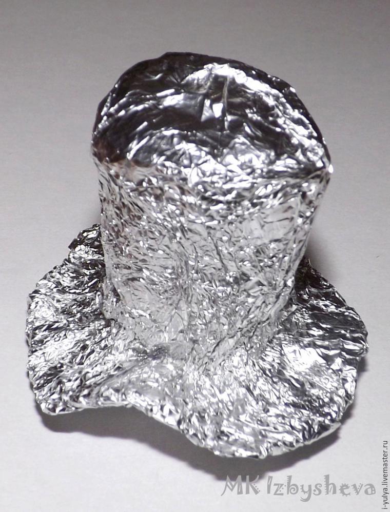 Ставим заготовку тульи на круг и вот уже эту конструкцию оборачиваем фольгой. Этот и предыдущий этап при создании шляпы я поменяла местами, потому что по-другому соединить две части шляпки очень проблематично, а фольга отлично скрепляет их между собой.