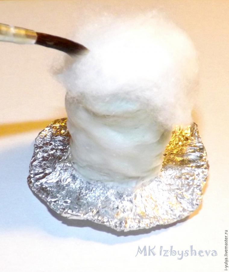 После того, как наша ватная заготовка полностью просохла, покрываем ее акриловой краской и даем высохнуть до момента, пока краска не перестанет липнуть.