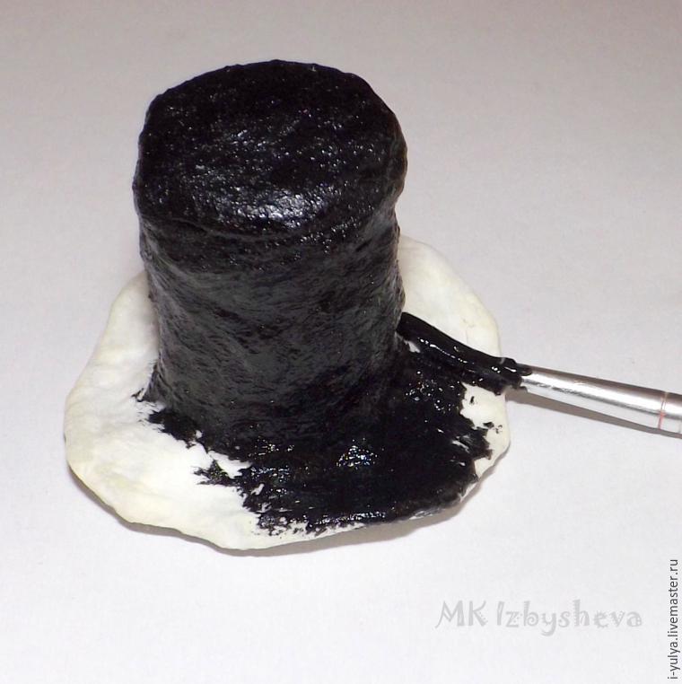 Затем контрастными штрихами (акриловая краска контрастного цвета) мы выделяем на шляпе изгибы и впадинки, придавая ей дополнительный визуальный объем. Покрываем шляпу акриловым лаком. И снова даем просохнуть, но теперь уже полностью. Как правило, полное высыхание краски происходит через 24 часа.
